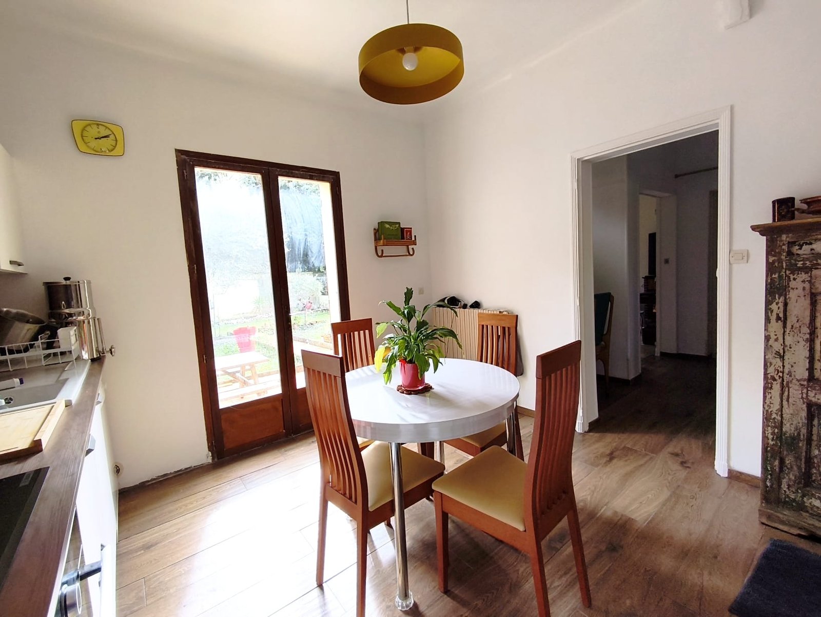 * Une cuisine entièrement équipée avec accès direct au jardin. La table avec rallonge permet d’accueillir jusqu’à 6 personnes.