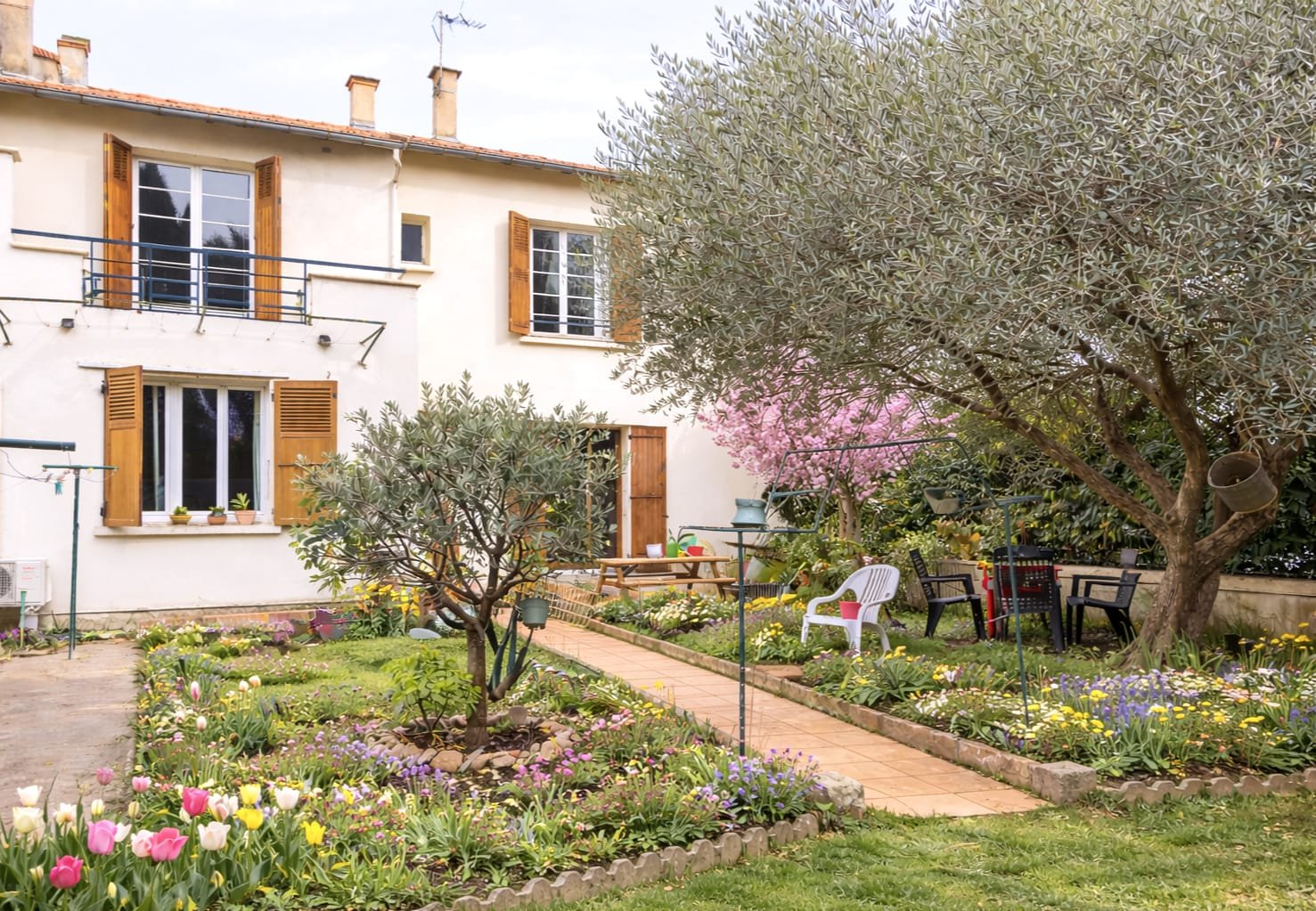 * Une chambre avec deux lits simples donnant sur un balcon avec vue sur le jardin (les lits peuvent être séparés ou rapprochés selon vos besoins).